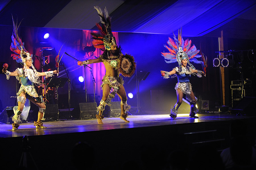 Deux danseuses, un danseur, cinq musiciens et un chanteur
